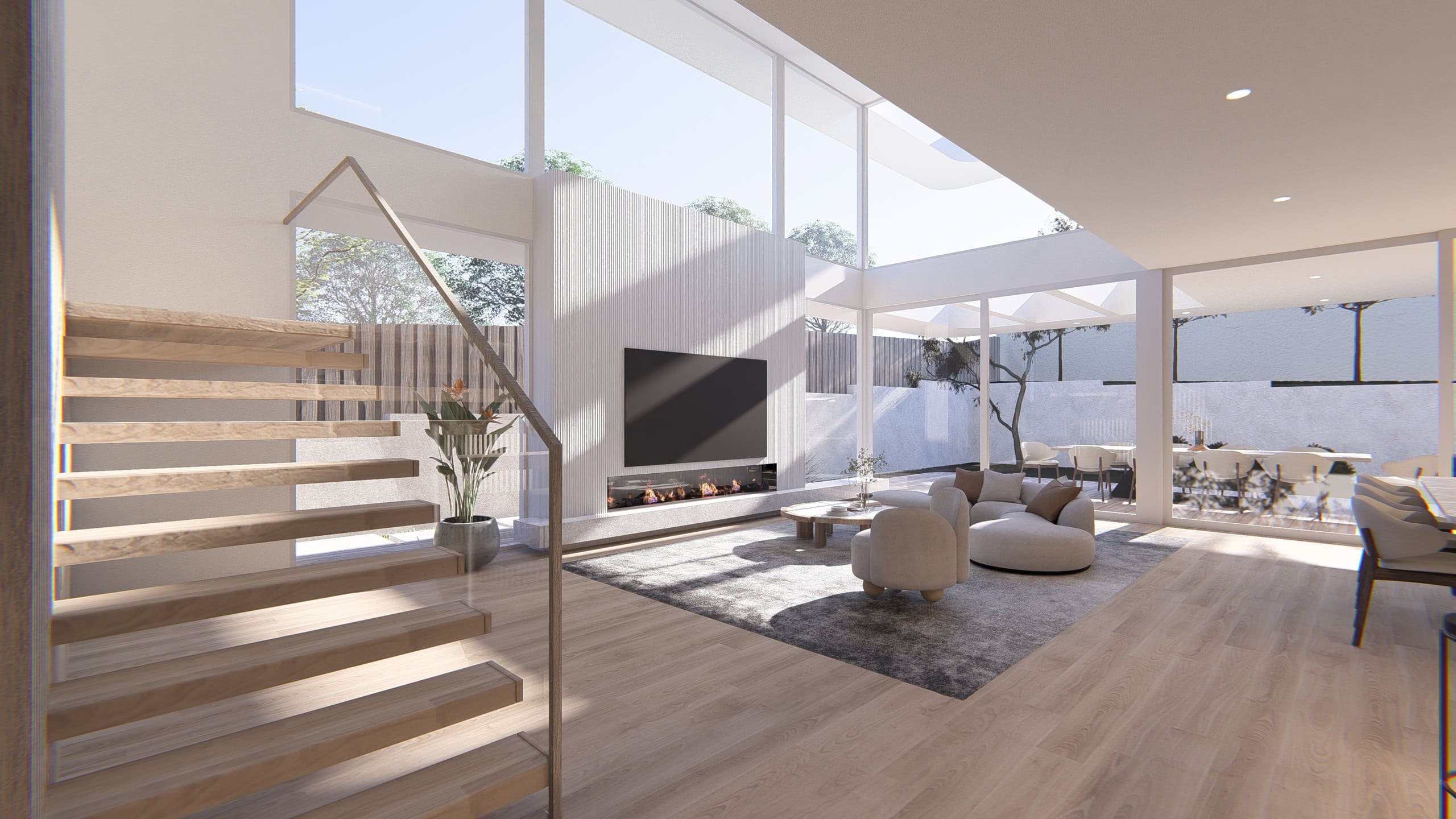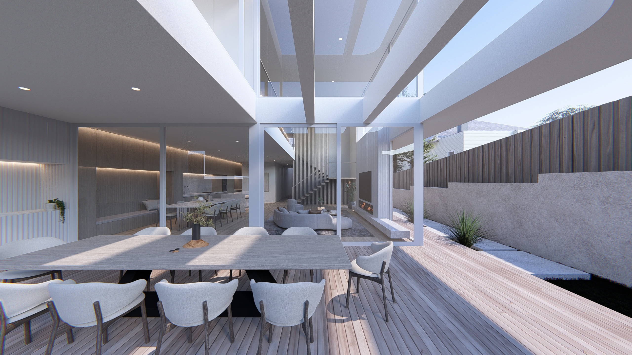 Upstairs, private retreat spaces overlook the void below, reinforcing a sense of openness while maintaining separation between communal and intimate zones. Environmental performance was carefully considered, with passive solar design, daylight optimisation, and cross-ventilation enhancing comfort year-round. Kew Modern House exemplifies Sky Architect Studio’s approach to contemporary residential architecture—where clarity of form, thoughtful detailing, and light-led design combine to create timeless modern homes in Melbourne.