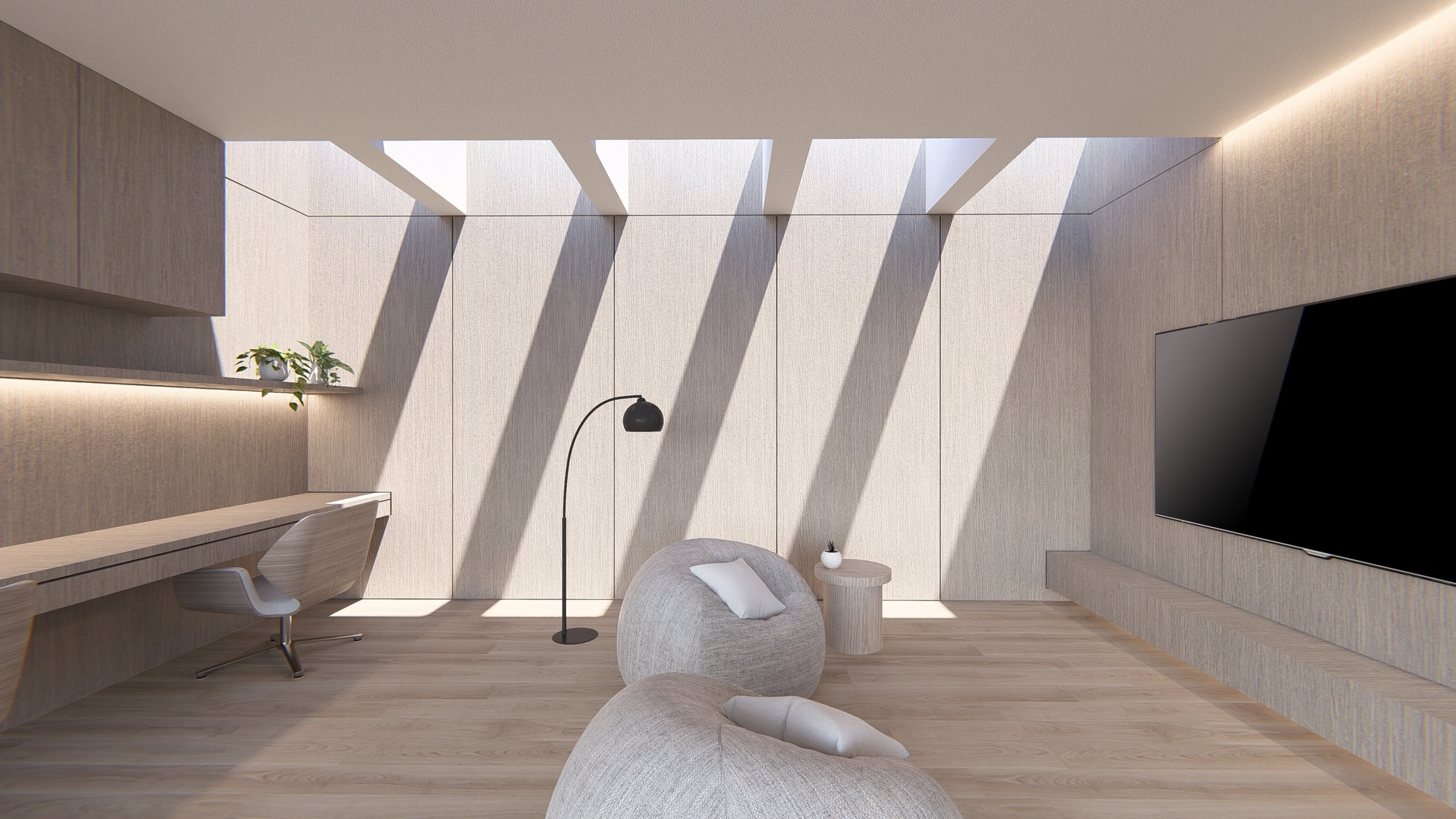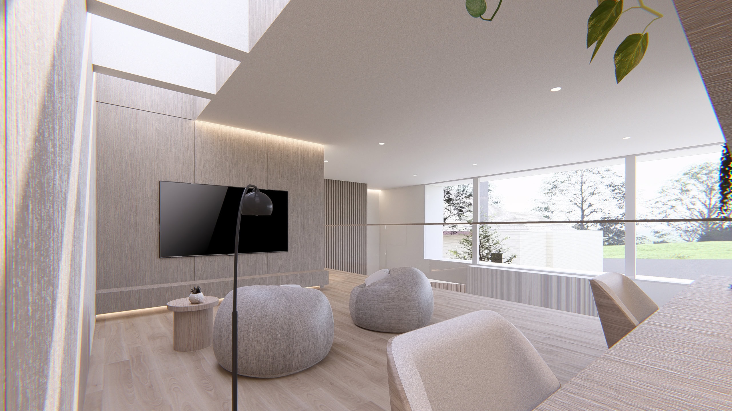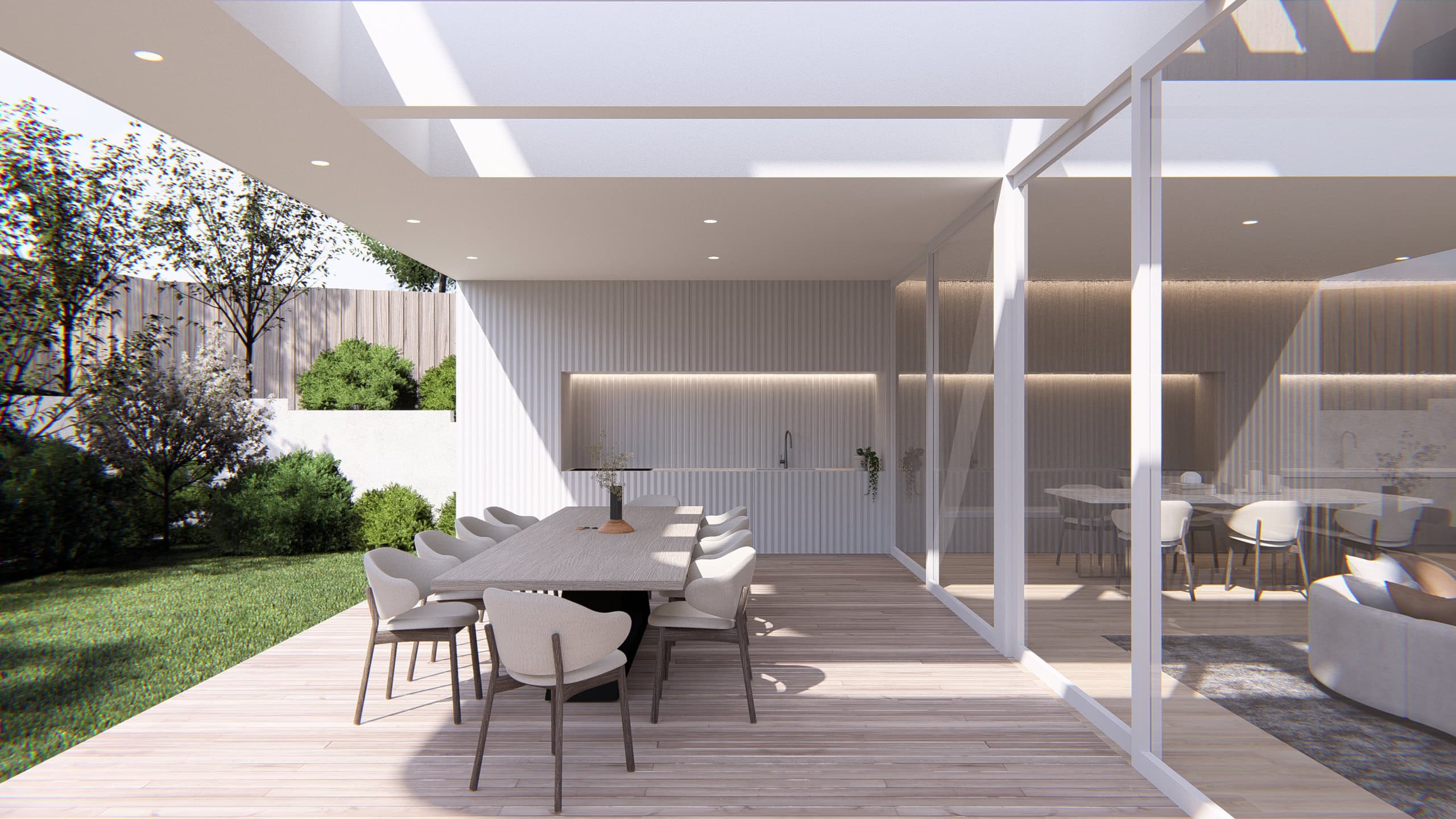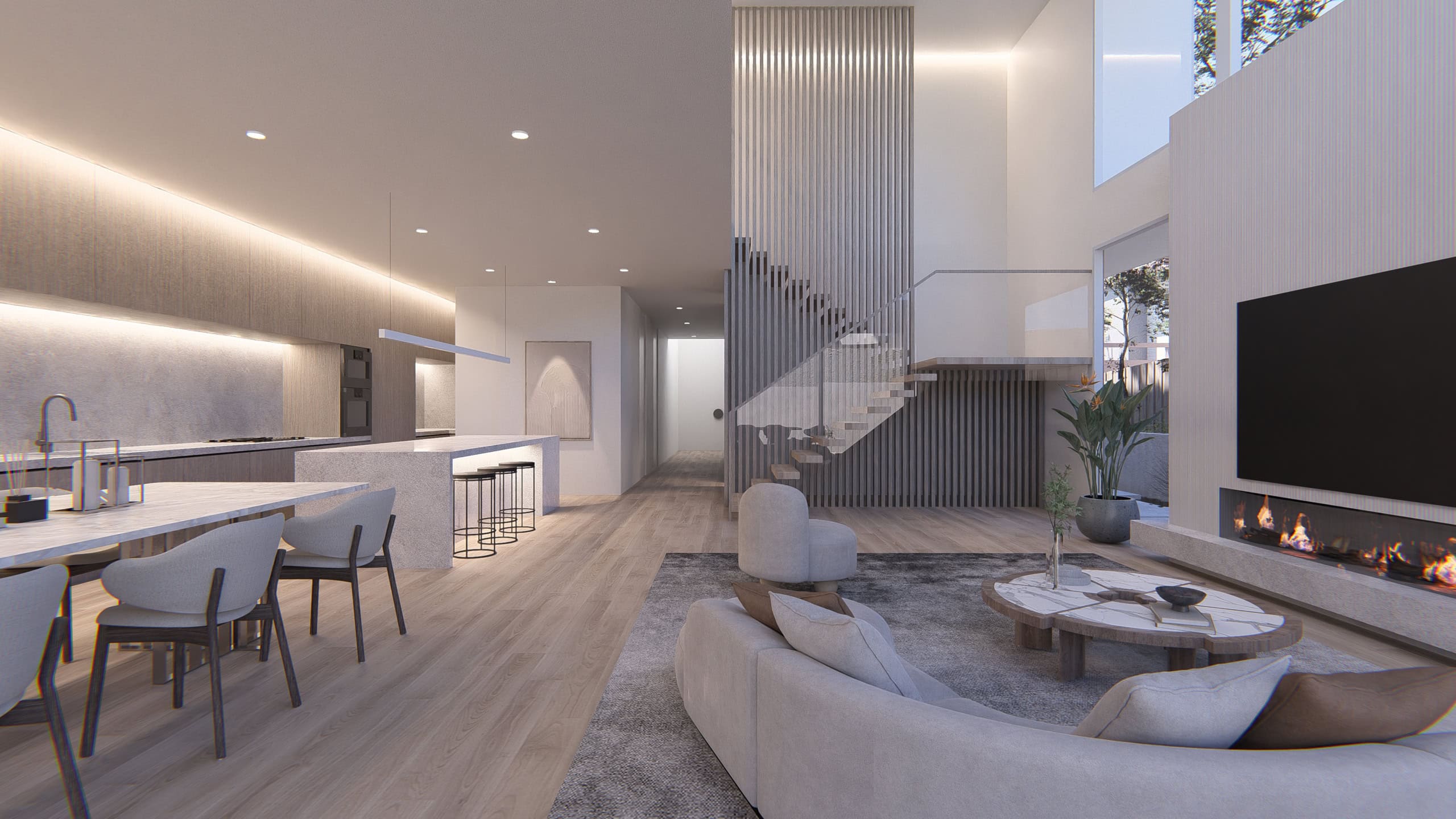 At the heart of the home is a dramatic double-height living space, where carefully positioned skylights and full-height glazing draw natural light deep into the interior throughout the day. The plan is organised around visual transparency and spatial flow, allowing living, dining, and kitchen zones to open seamlessly to the landscaped outdoor terrace. Soft curves, warm timber textures, and integrated joinery balance the architectural rigor, resulting in interiors that feel both luxurious and liveable.