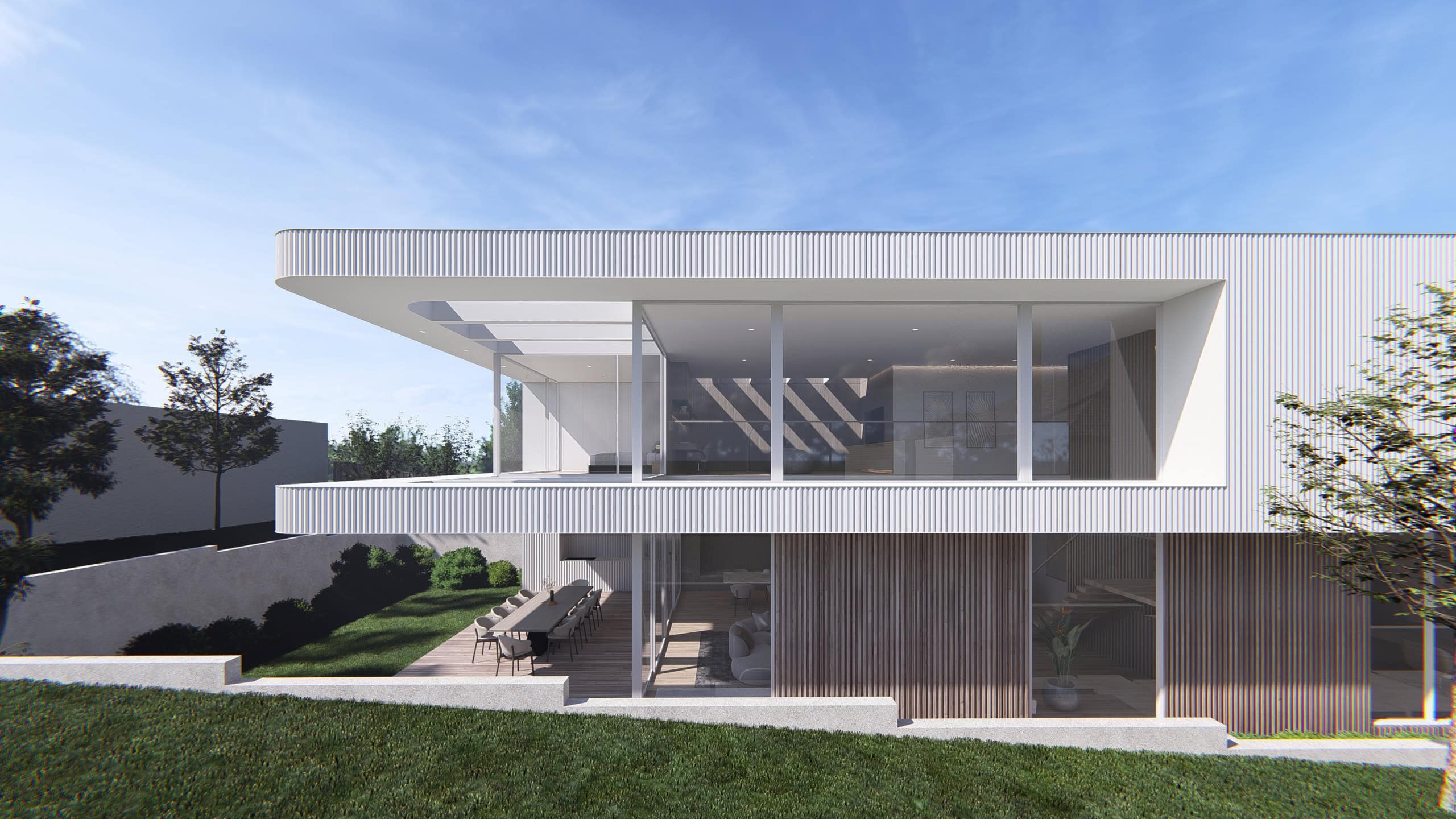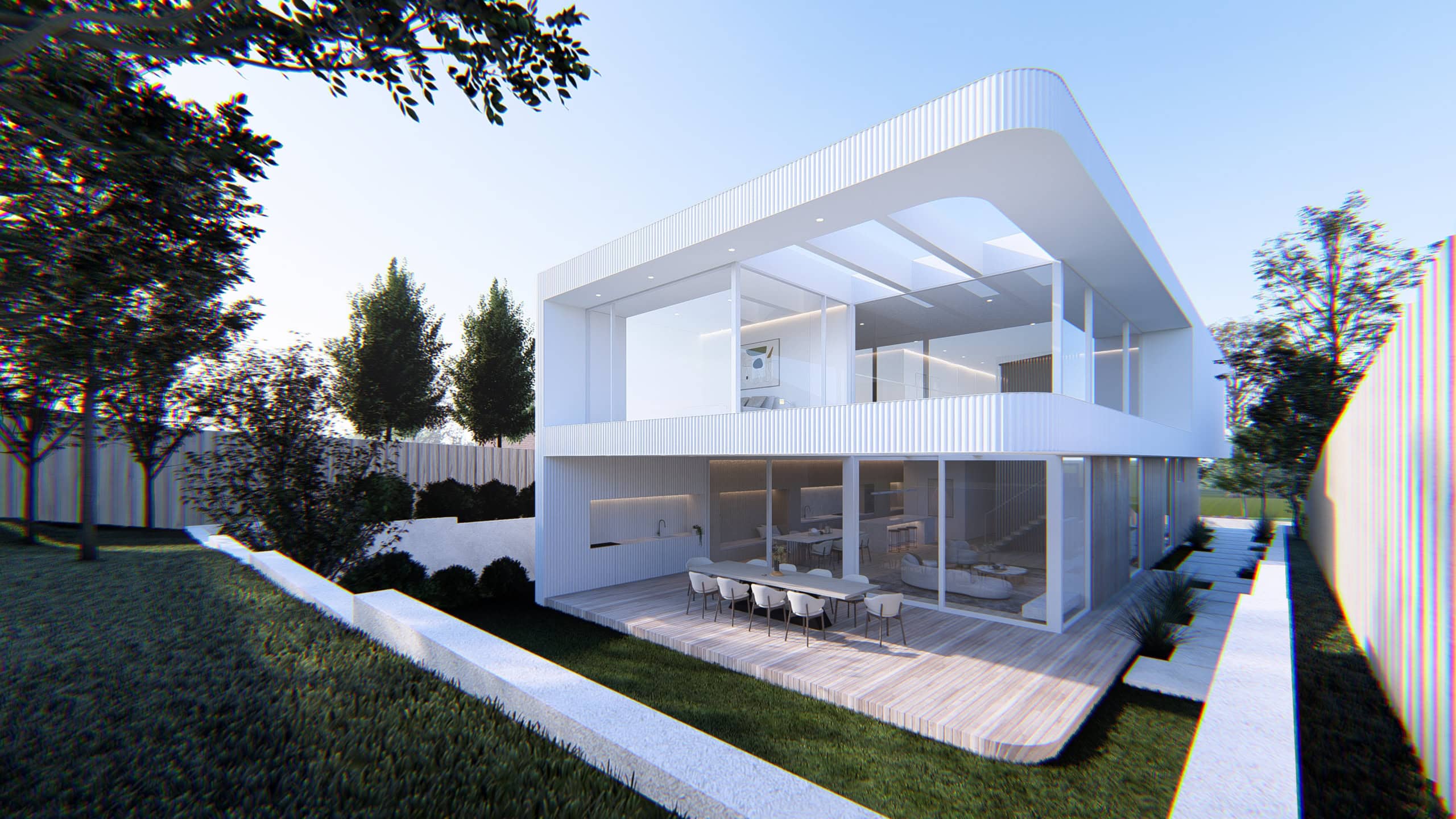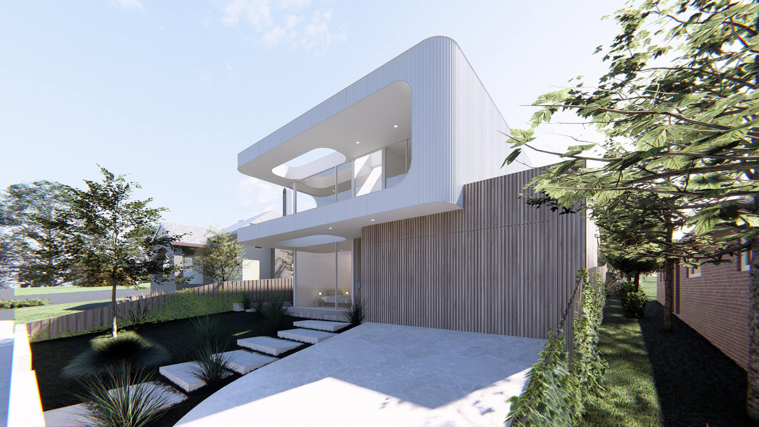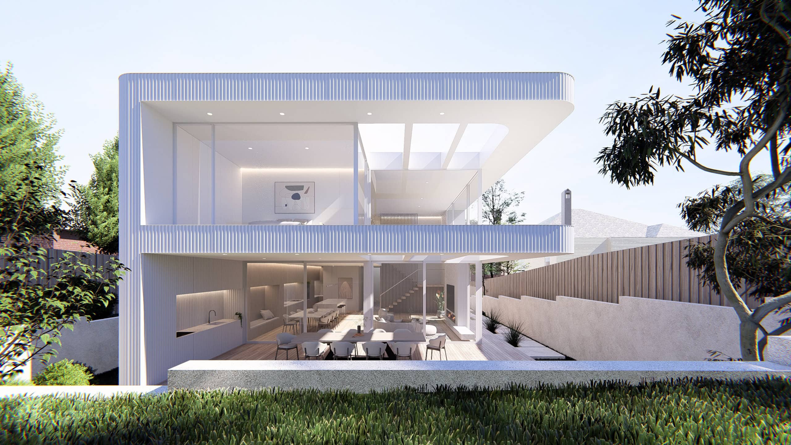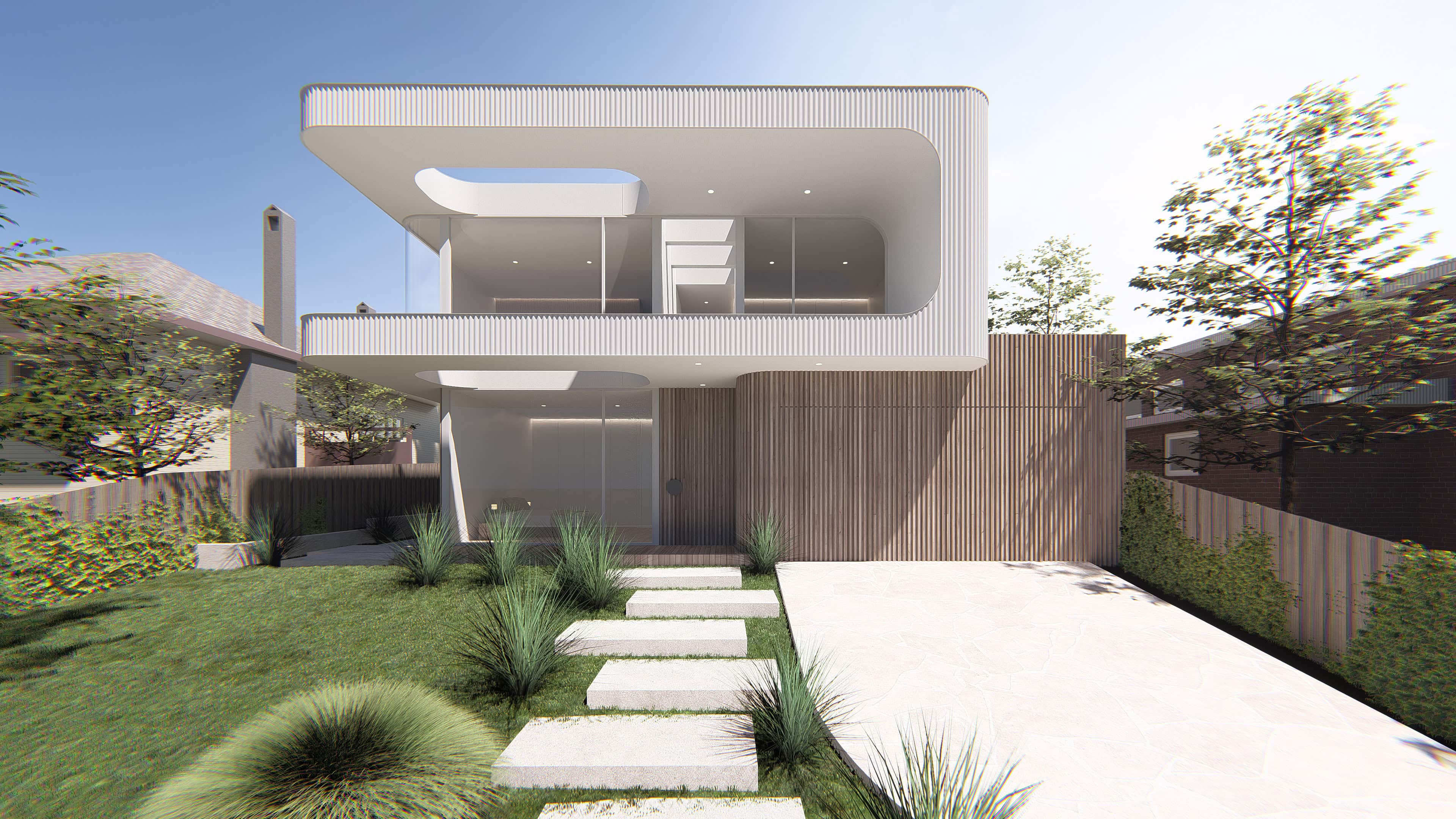 Kew Modern House is a refined contemporary residence that explores light, proportion, and softness through architectural form. Designed as a high-end family home in Melbourne’s inner east, the project is defined by its sculptural curved façade, layered materiality, and strong connection between indoor and outdoor living. A restrained palette of light-toned cladding, vertical timber battens, and expansive glazing creates a calm yet striking street presence while maintaining privacy within a suburban context.