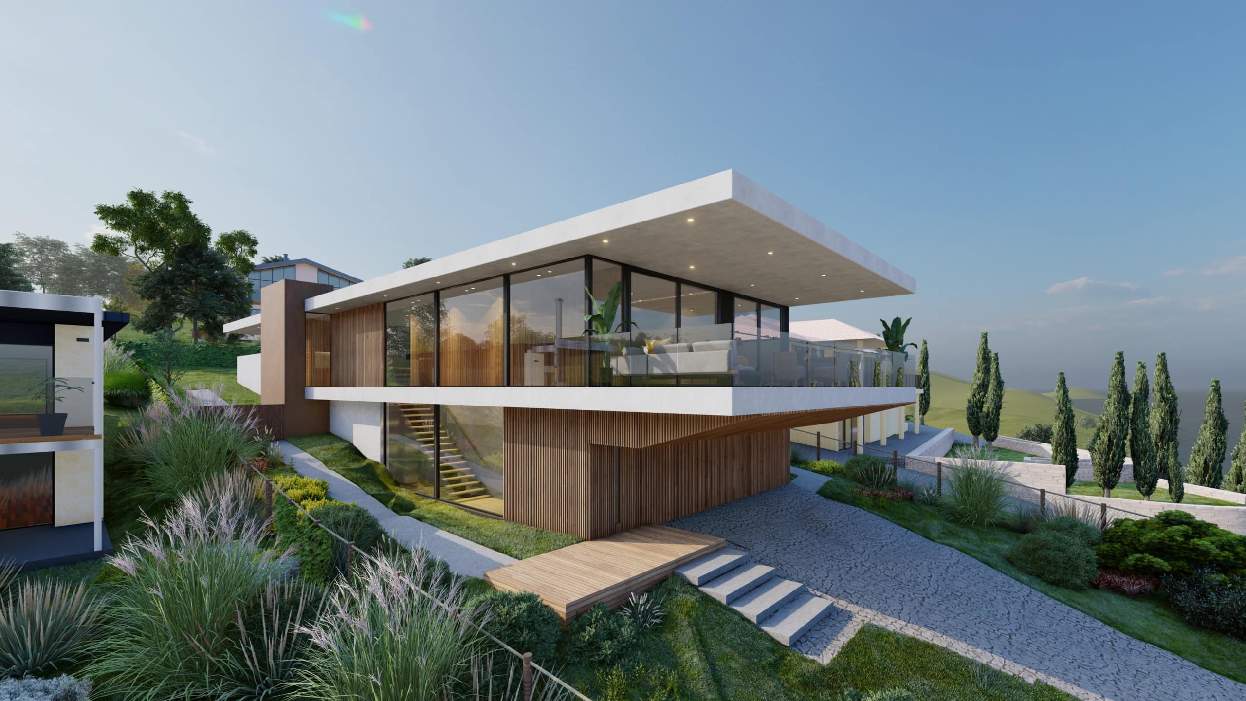 The open-plan living and dining areas are crafted for luxury and comfort. The minimalist interior design emphasizes clean lines and functional spaces, with carefully chosen furniture and decor enhancing the home’s sophisticated ambiance. The living room features a modern fireplace, adding warmth and elegance to the space, perfect for cozy gatherings and relaxation.