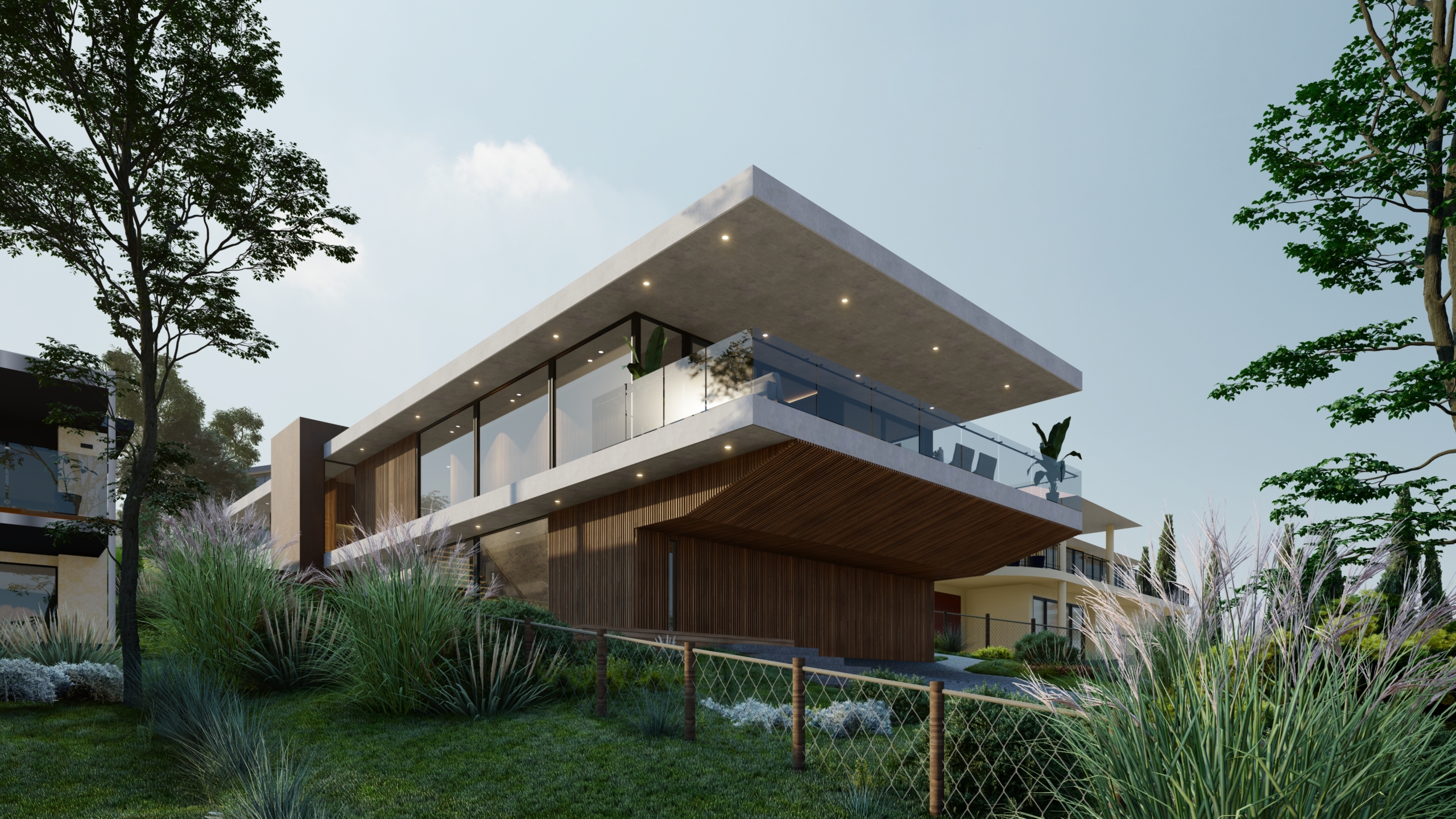 Designed for relaxation and enjoyment, the outdoor spaces of the Mount Martha Beach House include a stunning pool area and lush gardens. The design emphasizes a floating experience, with a long rectangular form and a cantilevered balcony that houses a swimming pool and large decking. Natural materials like wood and stone create a serene environment, with strategically placed lighting to enhance the evening ambiance.